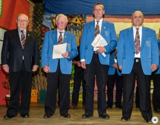 raditionell am ersten Dezemberwochenende lädt die Theatergruppe des GV „Freundschaft“ Busenbach in die Turnhalle des TV Busenbach ein, um mit einem Theaterstück in Mundart an zwei Abenden den Zuschauern einen kulturellen Leckerbissen zu präsentieren. Dieses Jahr wurde das Stück „Wenn der Hahn kräht auf dem Mist“ zum Besten dargeboten.Am Samstag wurde der Theaterabend musikalisch durch den Männerchor unter der Leitung von Matthias Hammerschmidt mit drei weihnachtlichen Weisen eröffnet. Zwischen den Liedvorträgen konnte der 2. Vorsitzende Klaus Huck zwei langjährige aktive Sänger ehren. Dabei gab es die Besonderheit, dass mit August und Georg Vogel - Vater und Sohn gemeinsam - für zusammen 95 Jahre Singen im Chor geehrt wurden, wie Franz Becker vom Chorverband Albtal sagte. Georg Vogel, Sänger im 2. Bass, erhielt für 25 Jahre die Silberne Ehrennadel des Badischen Chorverbands, sein Vater August für 70 Jahre die Goldene Ehrennadel des Deutschen Chorverbands. Von Seiten des GV „Freundschaft“ Busenbach überreichte der 2. Vorsitzende Klaus Huck die jeweilige Urkunde des Vereins und ein Weinpräsent.