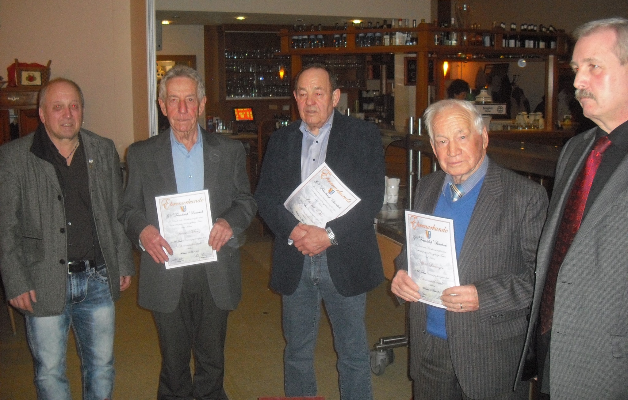 Zuvor jedoch wurde der musikalische Teil des Abends durch den Männerchor unter der Leitung von Vizedirigent Ralf Bauer mit weihnachtlichen Weisen eröffnet. Bei den Ehrungen überreichte Franz Becker, Ehrenbeisitzer der Chorverbandsgruppe Albtal, an Monika Vogel für 25 Jahr Singen im Chor eine Urkunde und die silberne Ehrenbrosche des Badischen Chorverbandes. Außerdem erhielt sie die Ehrenurkunde des Chorverbandes Karlsruhe und die silberne Ehrennadel des Vereins. Theo Idstein erhielt für 40 jährige Vereinszugehörigkeit eine Ehrenurkunde des Verein verbunden mit einem Weinpräsent. Anschließend begann die Aufführung des Theaterstückes.